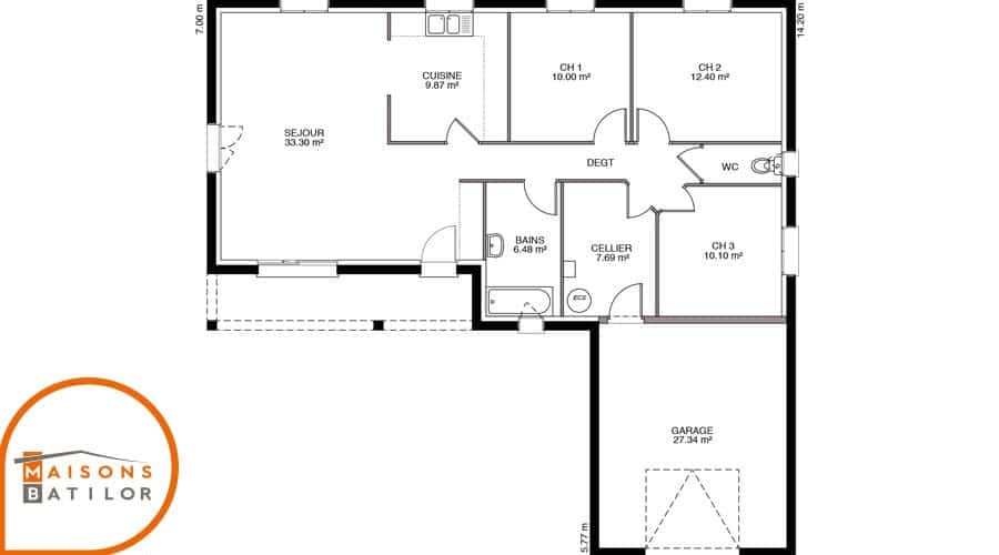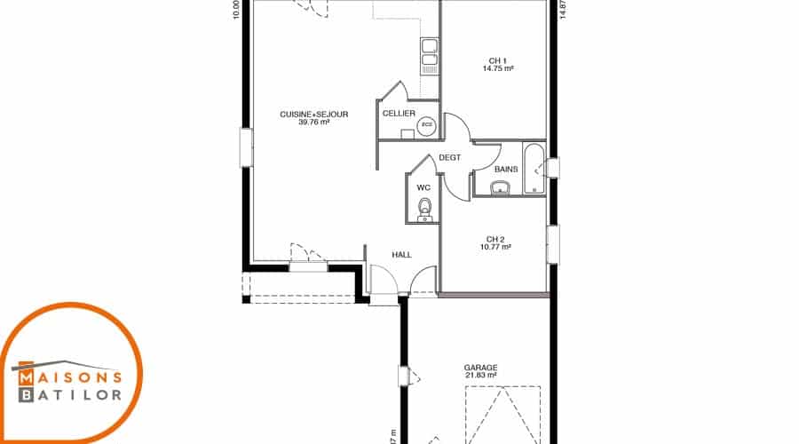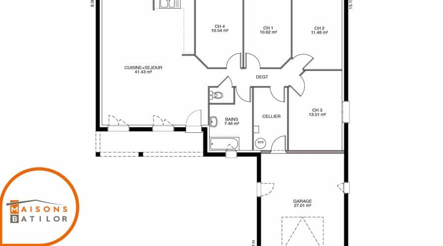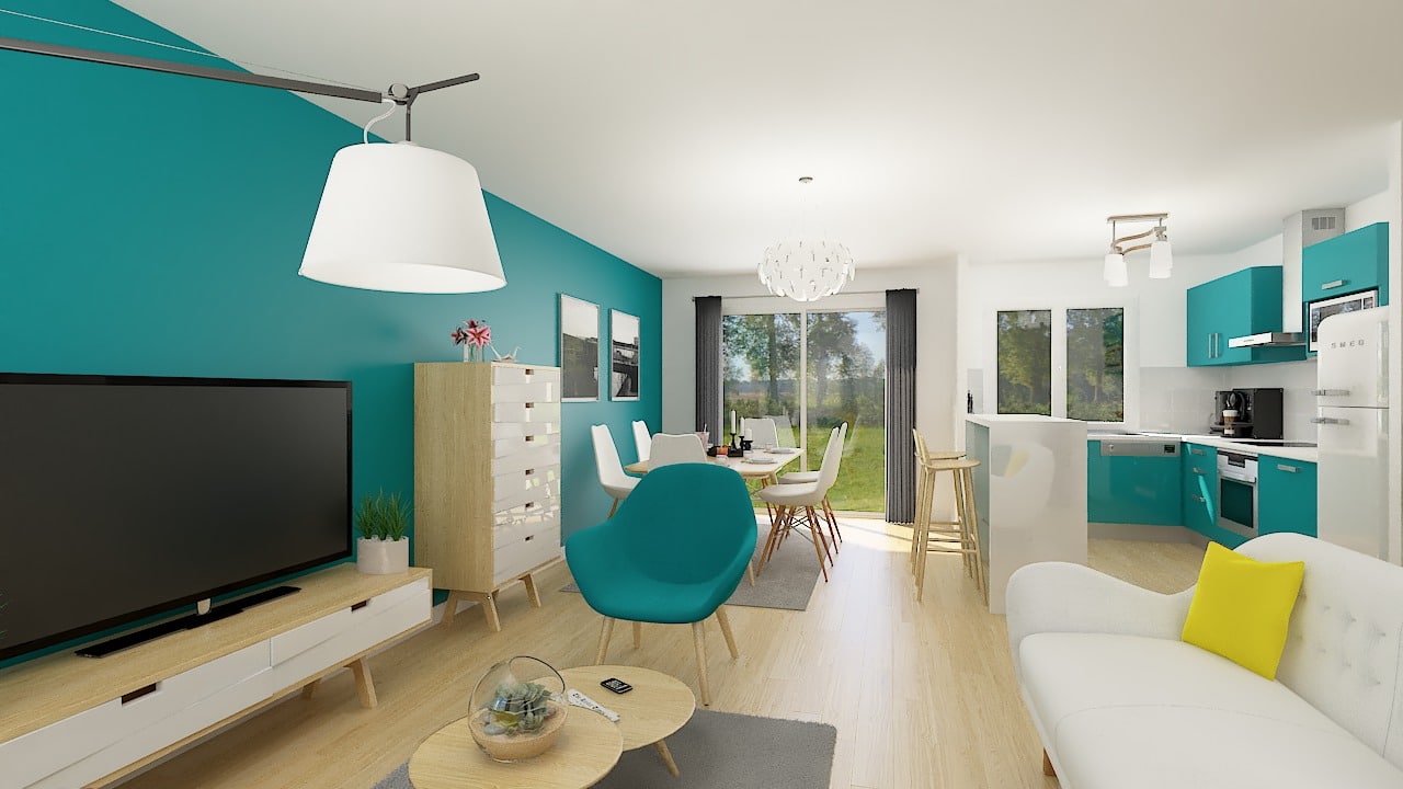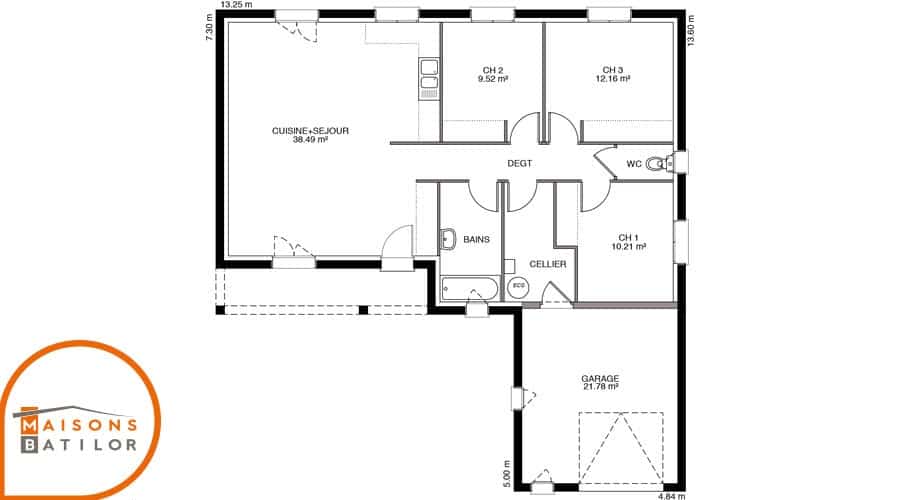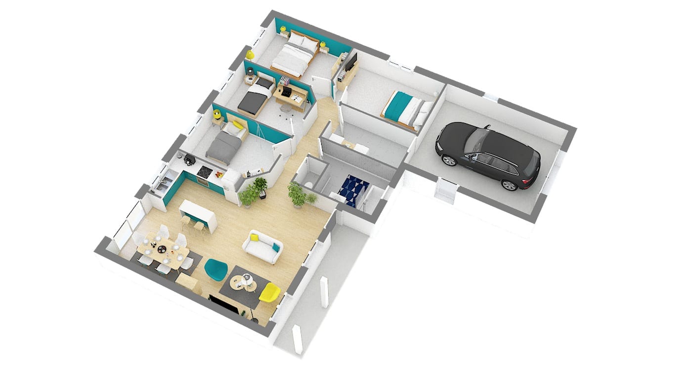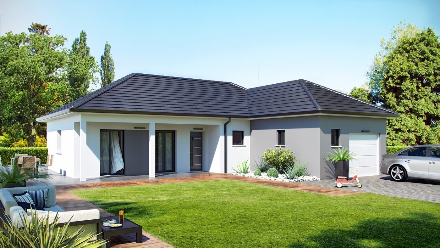 Maison avec un plan en « L » moderne, ce pavillon offre, avec un rapport qualité-prix séduisant, un espace de plain-pied avantageux et modulable avec son garage accolé et en avancée.