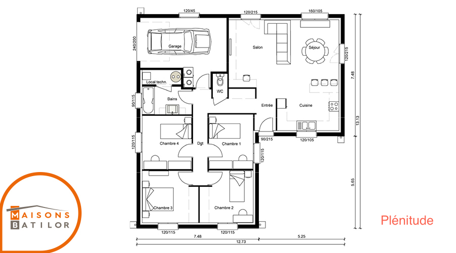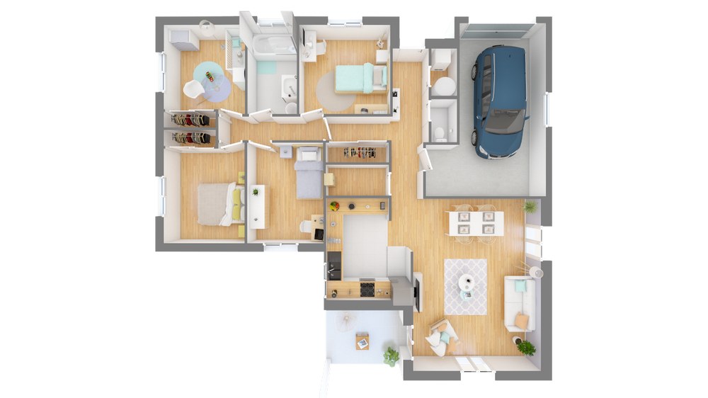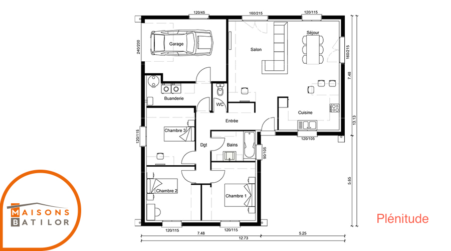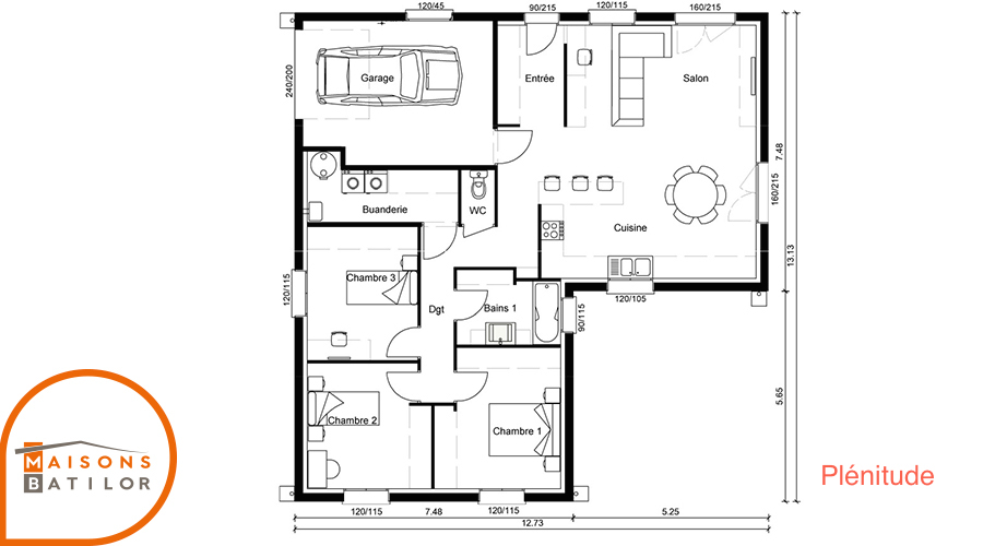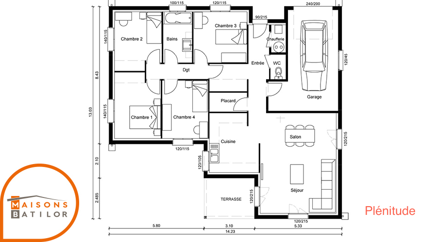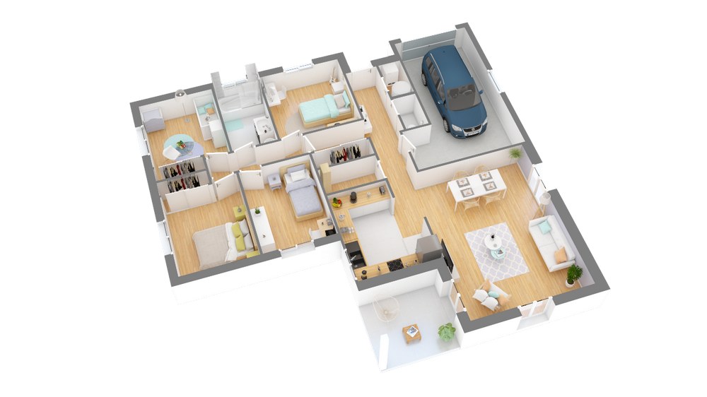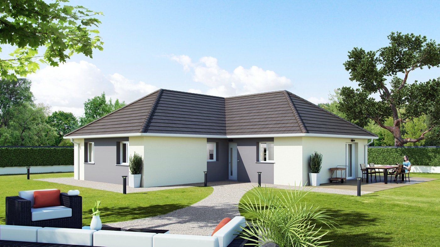 Avec sa forme en L, la Plénitude vous permet tout en restant sur une maison plain pied de bien séparer les parties jour et nuit. ce modèle propose dans toutes ses déclinaisons de base 3 à 4 chambre ainsi qu’un garage intégrée.