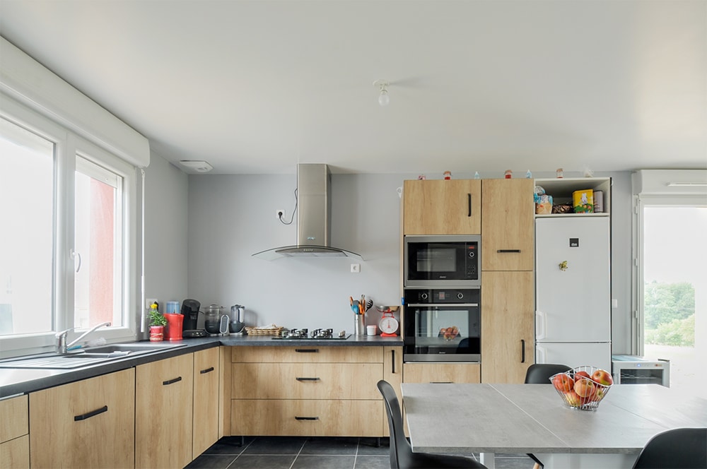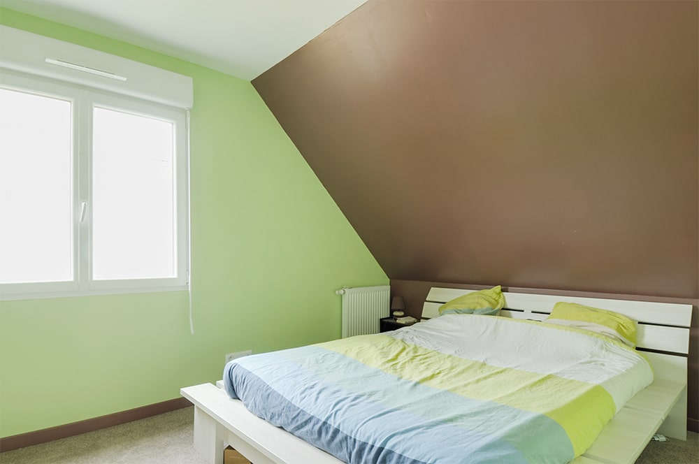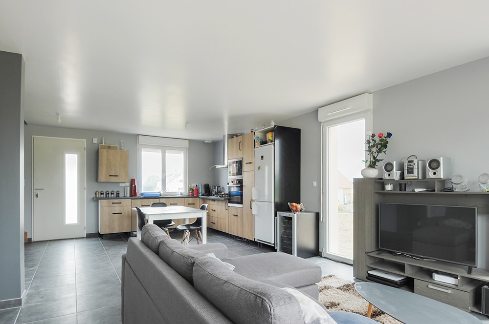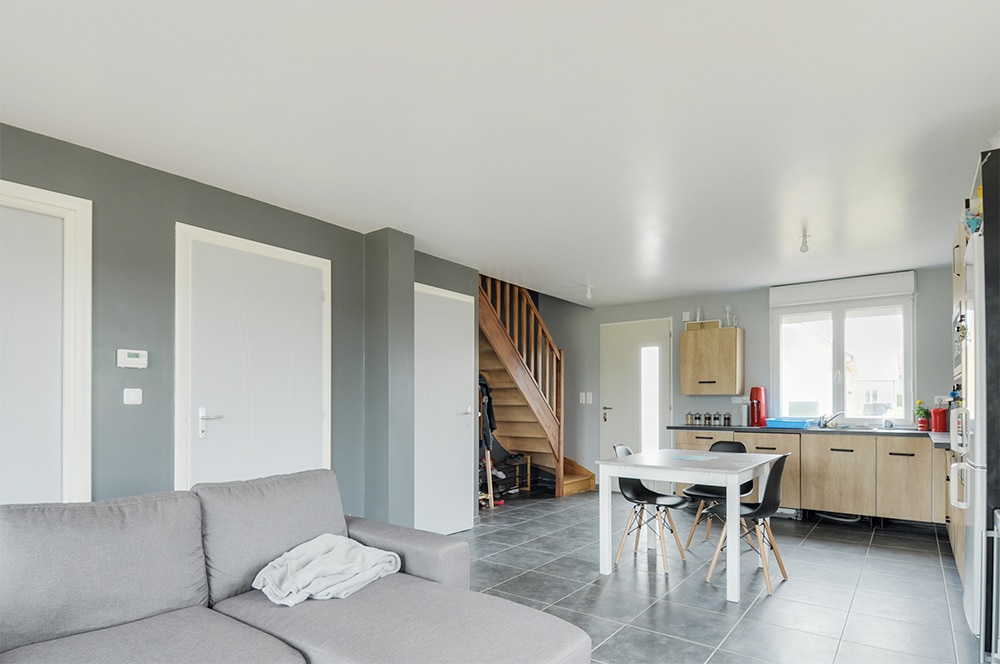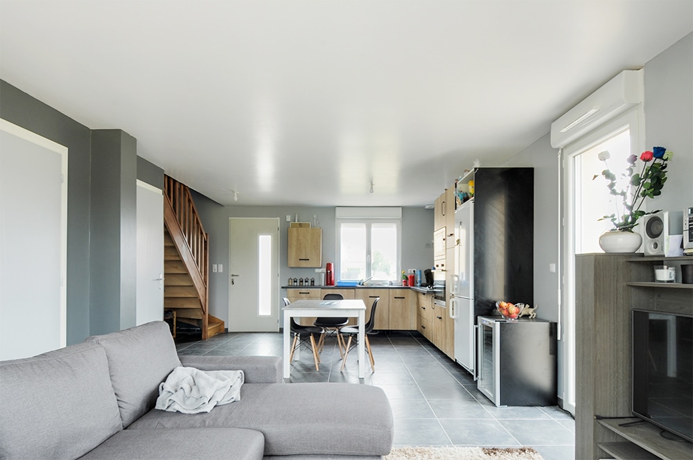 L’étage est réservé aux chambres. La soupente leur donne un caractère intimiste plutôt agréable. La belle salle de bain, spacieuse, comprend douche et baignoire ! La répartition de la maison sur deux niveaux fait la part belle au grand séjour traversant du rez-de-chaussée et à sa cuisine ouverte. Les portes-fenêtres font entrer la lumière, ce qui donne une pièce claire où il fait bon vivre. N’oublions pas que cette maison dispose d’un garage intégré.