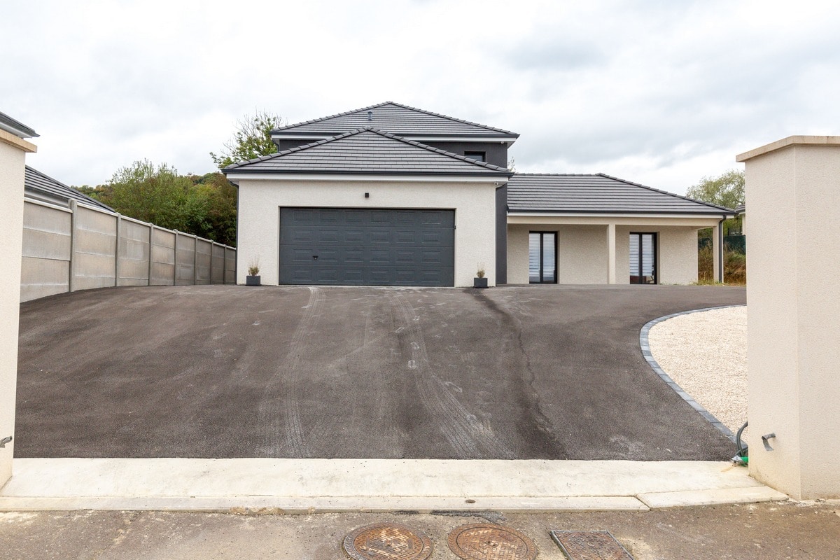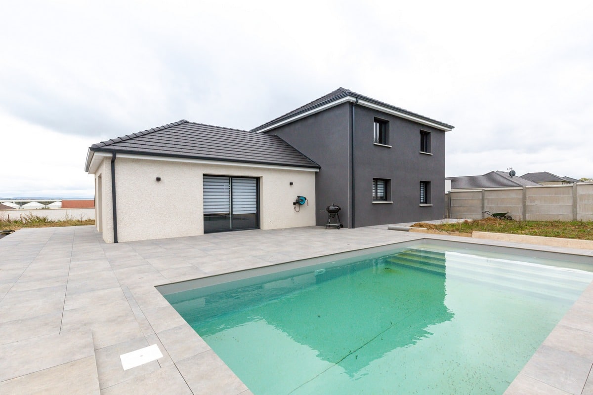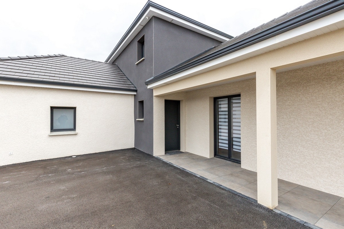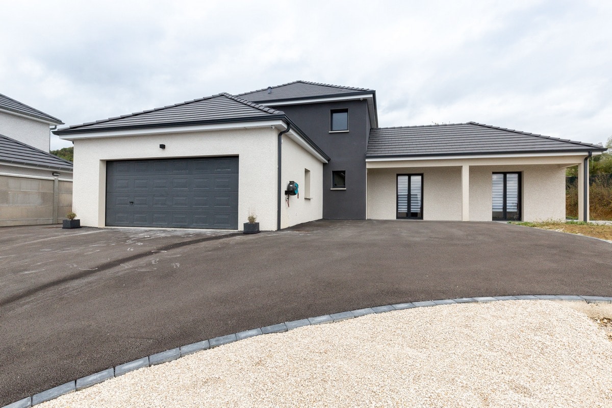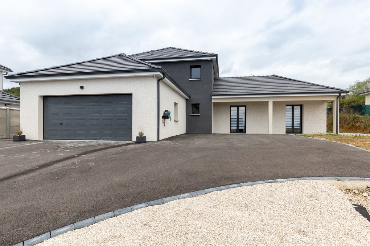 Découvrez cette belle maison moderne à étage tout juste livrée en Haute-Saône. Basée sur le modèle Lubéronne, cette maison offre un plan en L avec une tour centrale abritant en son étage l’espace nuit.
